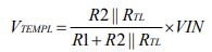 The voltage at the first pin TEMP of the NTC thermistor at temperature TL is: