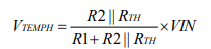 The voltage at the first pin TEMP of the NTC thermistor at temperature TH is: