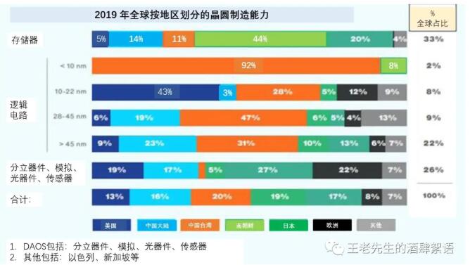 In logic or digital chips (such as computers and mobile phone microprocessors), the US does not produce any advanced process nodes (less than 10 nanometers), while Taiwan has 92 per cent. In other logic lock technology, the United States is very leading: 43% of the most advanced (10-22 nm) logic chips, and 6% to 9% of the previous generation (28 nm and above) logic chips are produced in the United States; Taiwan produces 47 percent of such logic chips, while China produces roughly 19 to 23 percent of logic chips. Finally, for the analog/discrete component segment, 19% are produced in the United States, 17% in China, and approximately 27% in Korea.