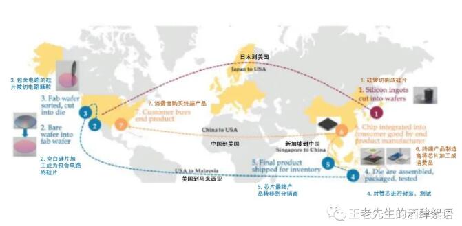 From design to packaging to integration into the final electronic products purchased by customers, the industrial chain is extremely complex and geographically dispersed. A typical semiconductor production process includes multiple countries and products may cross international borders 70 times due to the firm's specialization in specific links. The whole process takes up to 100 days, of which 12 days are transferred between the links of the supply chain. The following is a simple representation of the supply chain.