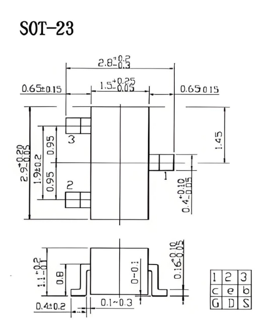 The diagram below illustrates a typical SOT-23 package size and pin arrangement: