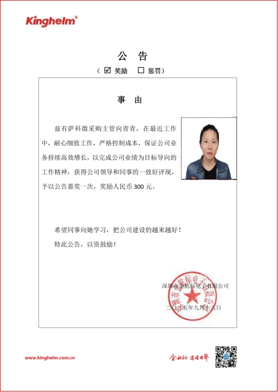 From September 15, 2025, to September 19, 2025, through colleague evaluations, the "Weekly Star" of Kinghelm (www.kinghelm.net) / Slkor (www.slkoric.com) is awarded to Slkor's Procurement Supervisor Xiang Qingqing. In recent work, she has demonstrated patient and meticulous efforts, strictly controlled costs, and ensured the company's business continues to grow efficiently. Her goal-oriented work ethic, focused on achieving company performance targets, has received unanimous praise from company leadership and colleagues. She is hereby announced for a commendation and a reward of RMB 300.