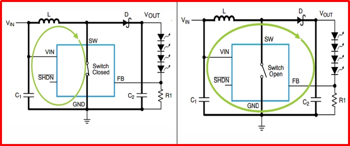 The SL4139 is a high-frequency switching regulator. To reduce EMI, ripple, and noise, the PCB traces carrying high-frequency switching currents must be laid out carefully. The bold lines in the figure above indicate the paths of the high-frequency switching currents. All these traces should be short and wide to minimize parasitic inductance and resistance. In the figure below, Loop ① is the current path when the internal SL4139 switch is closed. Loop ② is the current path when the internal SL4139 switch is open. The areas of both loops should be kept as small as possible.