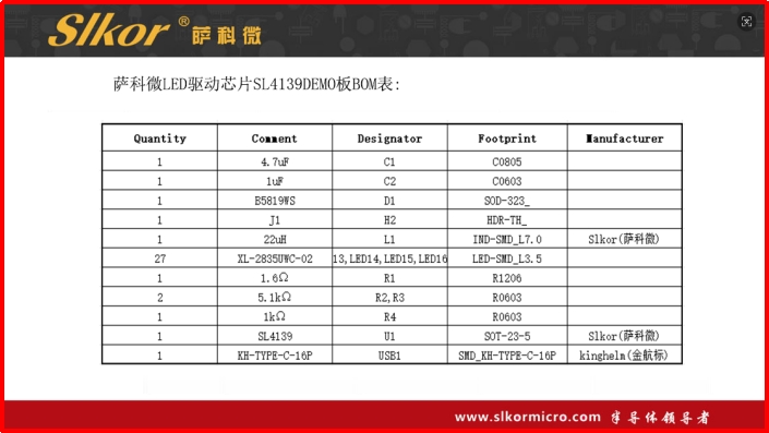 7. BOM (Bill of Materials) Information for the Slkor LED Driver Chip SL4139 DEMO Board is as follows: