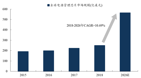 根据前瞻产业研究院的统计和预测,全球电源管理芯片市场规模从2015年的191亿美元增长到2018年的250亿美元。2019年仍保持着高速增长,其中以中国大陆为主的亚太地区是未来最大增长区域市场。预计到2026年全球市场规模将达到565亿美元,2018-2026 期间年复合增长率(CAGR)为10.69%。