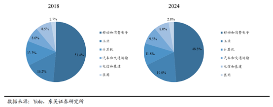 根据Yole的统计,预计2018-2024年期间,移动通信和消费电子应用在全球电源管理芯片市场的占比将由51.4%降为48.8%,但仍是电源管理芯片的最大细分市场。此外,工业和计算机也是电源管理芯片的主要细分应用领域。