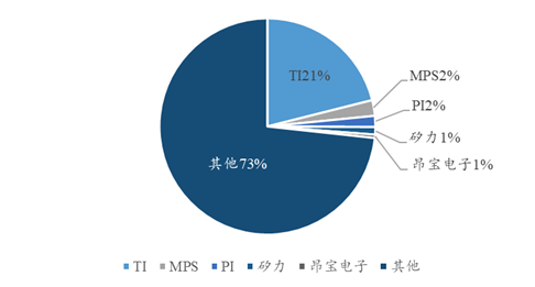 目前,全球电源管理芯片市场主要被国际巨头公司垄断。从2018年市场占有率来看,TI、高通、ADI、Maxim和英飞凌五家厂商合计占71%。此外,NXP、MPS、安森美和Diodes等国际厂商也拥有极强的技术和市场实力。而国内电源管理芯片厂商则相对弱小而分散,整体实力仍比较薄弱。