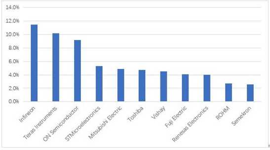2019全球年功率半导体市场的主要厂商及市场份额如下: