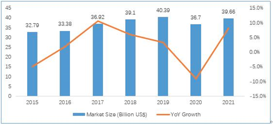 根据IHS数据,2018年全球功率半导体市场规模约391亿美元,2019年全球功率半导体市场规模达到403亿美元。预计2021年市场规模将增长至441亿美元,2018-2021年的CAGR为4.1%。其中,中国市场占比约35%,市场规模达138亿美元,同比增长9.5%,是全球功率半导体最大的单一市场。