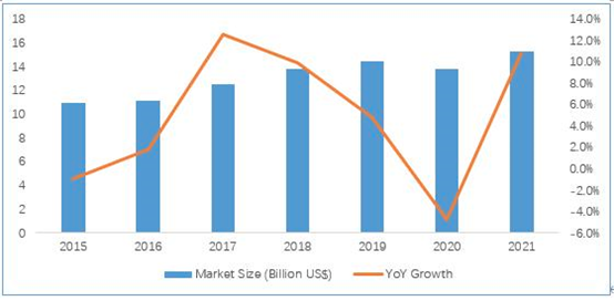 2019年中国的功率半导体市场约144.8亿美元,占全球功率半导体市场的35.9%。2020年将出现负增长,下降到138亿美元。预期2021年恢复增长,增长率超过10%。