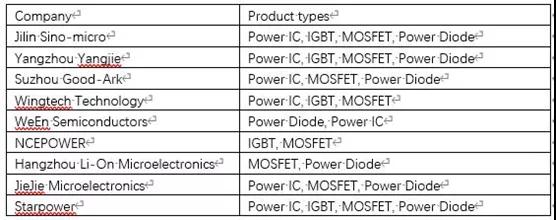 下表列出了部分国产功率半导体厂商及其主要产品。