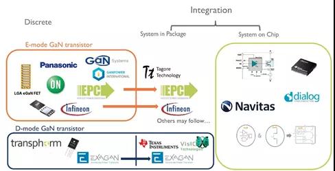氮化镓(GaN)器件可分为分离器件和集成器件两大类,其中分离器件主要包括增强模式(E-Mode) GaN晶体管和耗尽模式(D-Mode) GaN晶体管,代表厂商包括松下、EPC、英飞凌、安森美、GaN系统和Transphorm等。集成器件又分为系统级封装集成和系统级芯片集成,代表厂商包括TI、EPC、英飞凌、纳微(Navitas)、Power Integrations(PI)和dialog等。