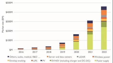根据Yole对GaN应用的细分市场预测,从2019年开始,GaN在电源应用领域开始快速增长,预计到2022年将超过2亿美元,其中移动设备快充充电器是其主要驱动力。
