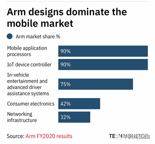 Arm的许可模式使它向芯片制造商出售IP而自己不生产任何芯片,从而使它成为了芯片市场的“瑞士”,并且与厂商保持中立状态在制造商中非常受欢迎。它的设计在手机市场以及物联网设备和联网汽车等其他增长领域中占据了主导地位。