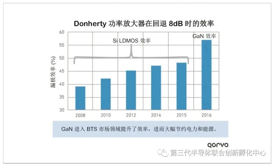 进入 RF 氮化镓 (GaN) 的世界 – 这项高效、宽带隙、可靠的功率 PA 技术使网络效率逐年大幅提高。如下图所示,在基站收发台 (BTS) 生态系统中引入 GaN 后,前端效率大幅提升,使其成为适合高功耗和低功耗应用的一项全新首选技术。