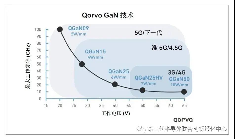 为了满足多样的 5G 要求,GaN 制造商需要提供跨越宽频率和功率水平范围的多个变体。有了多个 GaN 工艺可供选择,设计人员可以将 GaN 技术与应用进行最优匹配。以下图表说明了 Qorvo 在这个领域的能力。