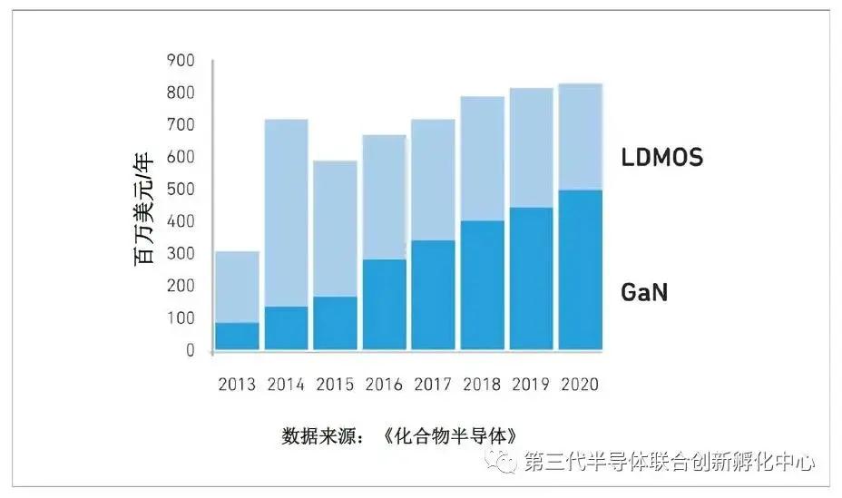 如今,GaN 被大量应用于小型蜂窝和 BTS 市场领域,并在 2016 年继续呈上升势头。GaN 出货量在 2016 年预计达到近 3 亿美元,远超过 2015 年的 1.5 亿美元。