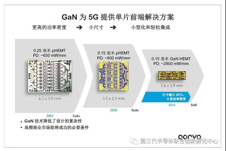 GaN 非常适合提供毫米波领域所需的高频率和宽带宽。它可以满足性能和小尺寸要求,如上图所示。