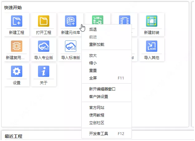Forward/backward: when other web pages are opened on the client, you can use this forward/backward to return to the previous page or the next page.Reload: Reload the current editor or page.Zoom in/out/reset/full screen: Scale the client interface size.New editor window: It is the same as clicking the logo in the upper left corner of the editor, so you can open multiple editors. When you open multiple editors, you can open different projects and copy and paste documents and components. Open the schematic diagram and PCB of the project separately (mutual positioning and data updating are not supported at present, but will be supported in V1.5)
