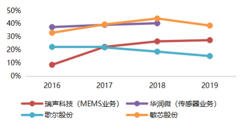 图12 部分MEMS上市公司历史毛利率(%)
