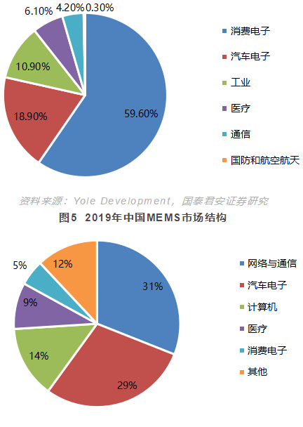 Consumer electronics and automotive are the main applications of MEMS. From the perspective of global MEMS market structure in 2019, consumer electronics is the main application field, accounting for nearly 60%; Automotive is the second largest application area, accounting for about 19%. In terms of MEMS market structure in China in 2019, networking and communications, computers, and consumer electronics together accounted for 50%, while the automotive sector accounted for 29%.