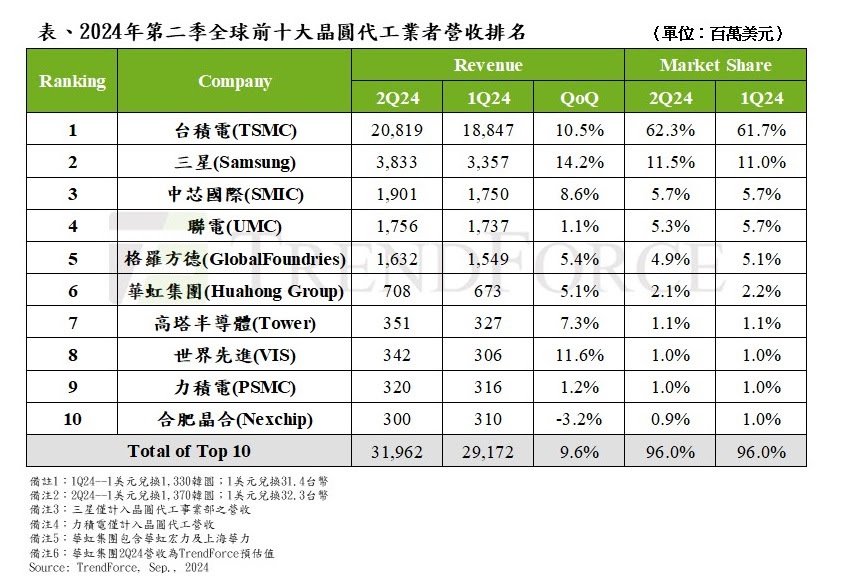 TSMC: In the second quarter, TSMC experienced a 3.1% increase in wafer shipments from the previous quarter. Revenue grew by 10.5% to $20.82 billion, largely due to the high contribution from advanced process technologies. TSMC maintained a dominant market share of 62.3%.