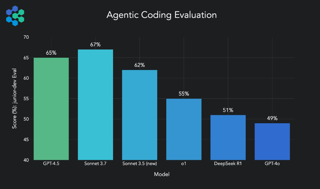 In reality, the two major models have slightly different focuses in programming. GPT-4.5 excels in tasks involving architecture and cross-system interactions, while Claude 3.7 Sonnet performs better in raw coding and code editing.