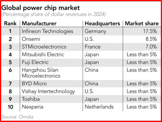 1. According to Omdia, in 2024, only three Japanese companies remain in the global top ten power semiconductor market: Mitsubishi Electric, Fuji Electric, and Toshiba. Their market shares are all below 5%.