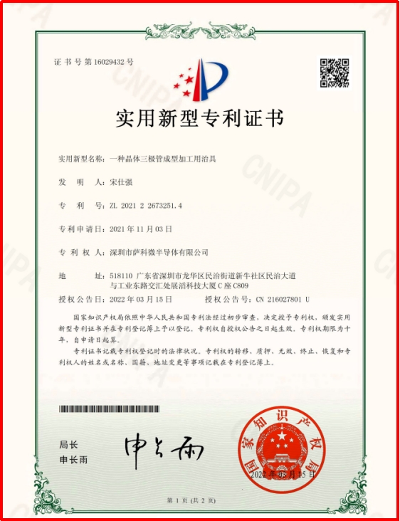 Following the grant of three utility model patents by the China National Intellectual Property Administration in March 2022—"A MOSFET Packaging Structure," "An IGBT Power Module Installation Structure," and "A Fixture for Transistor Forming and Processing"—another utility model patent, "A Heating Device for Thyristor Processing," was granted in April 2022. This further strengthens Slkor's intellectual property portfolio and demonstrates the continuous enhancement of the company's capabilities.