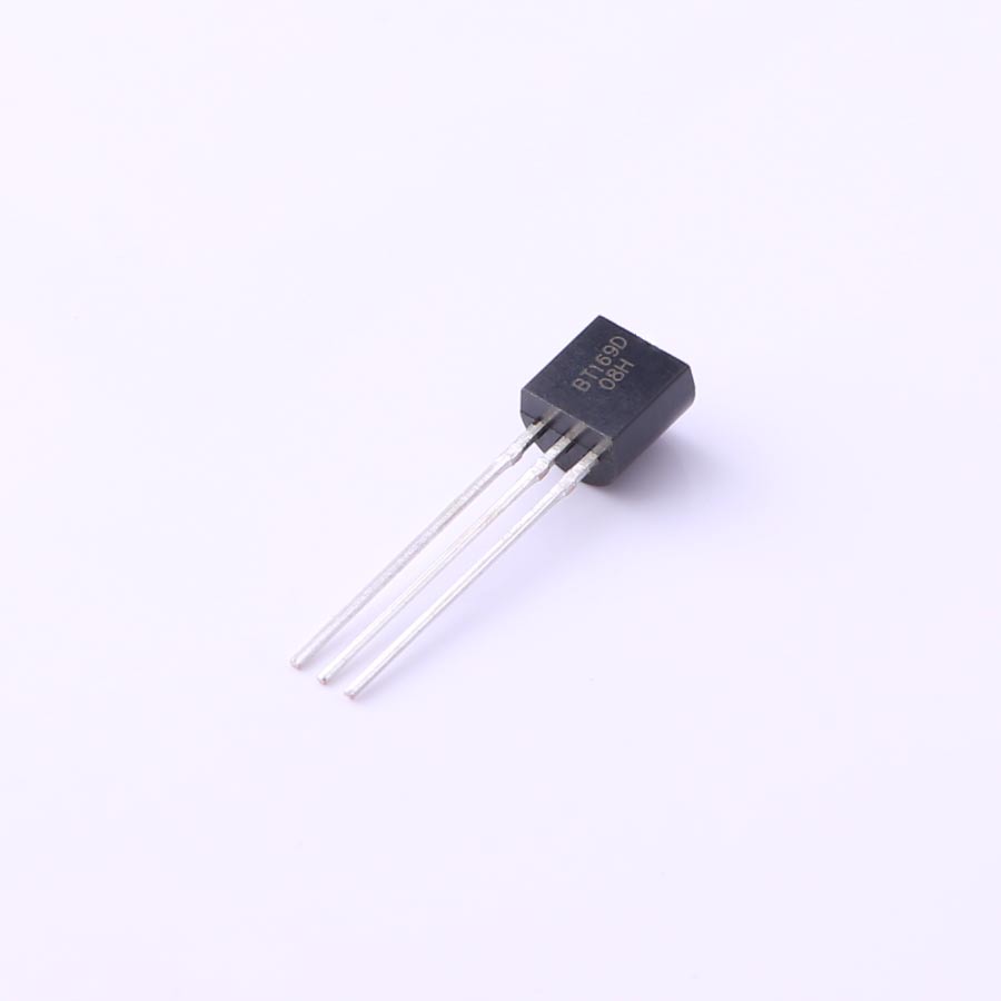 SCR BT169D in TO-92 package, featuring 600V VDRM, 0.8A IT(RMS), 200µA Max IGT, and 0.8V VGT. Suitable for efficient control in low-power applications.