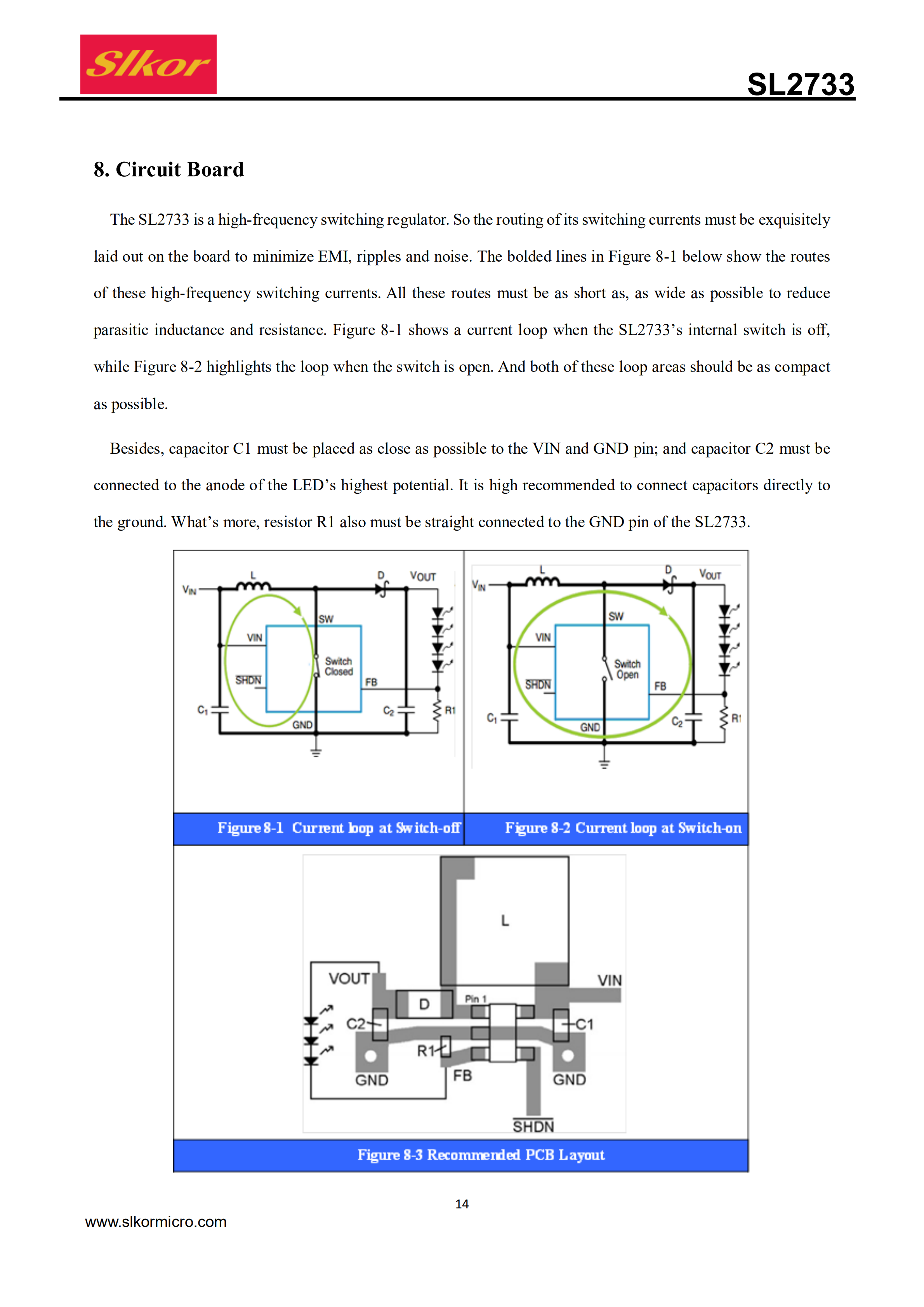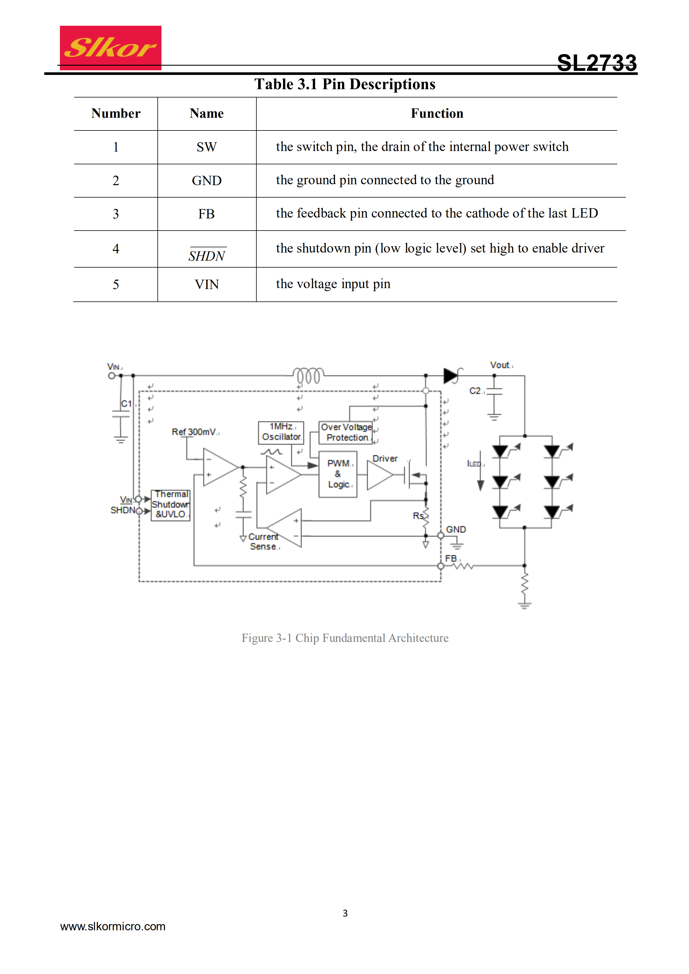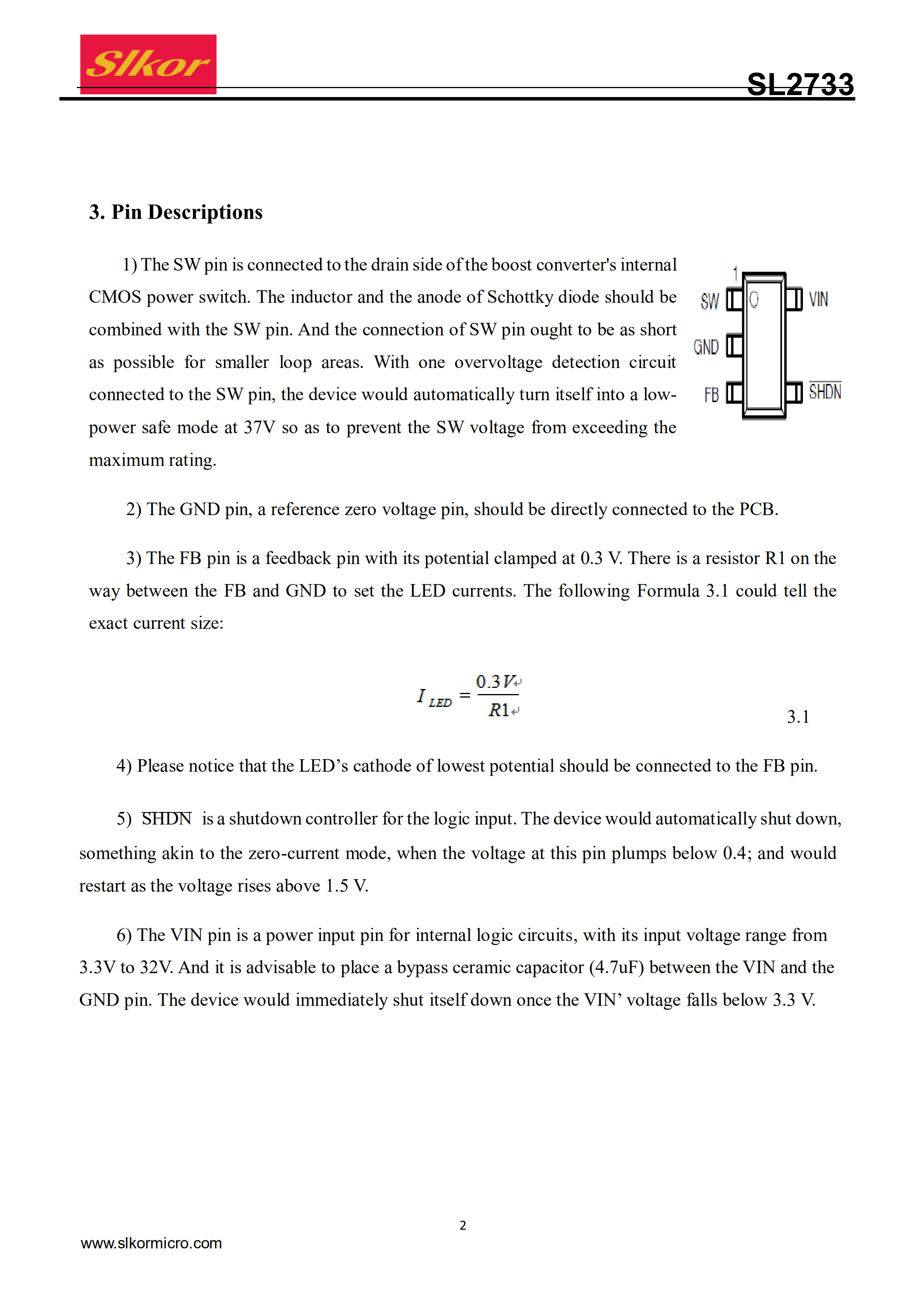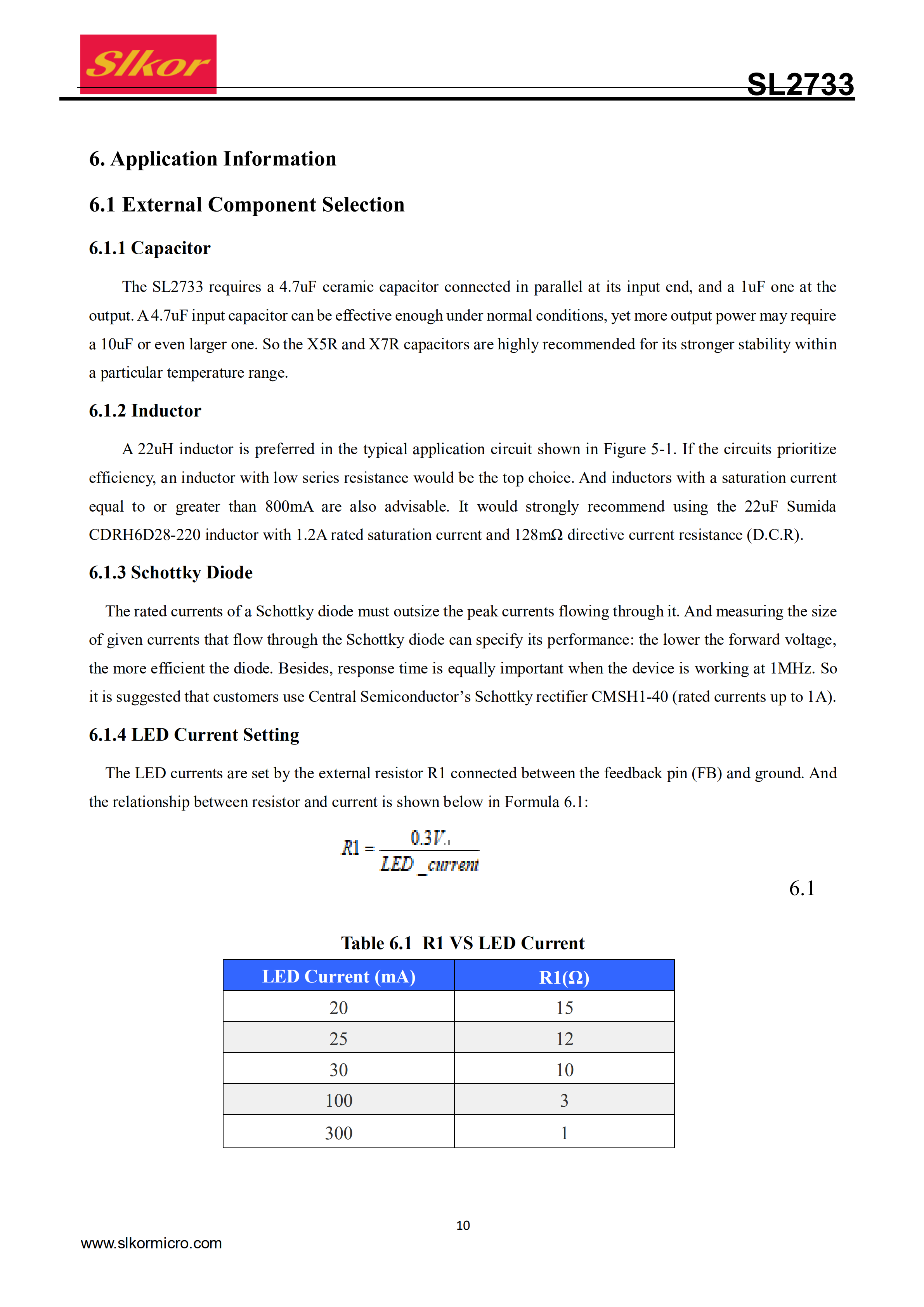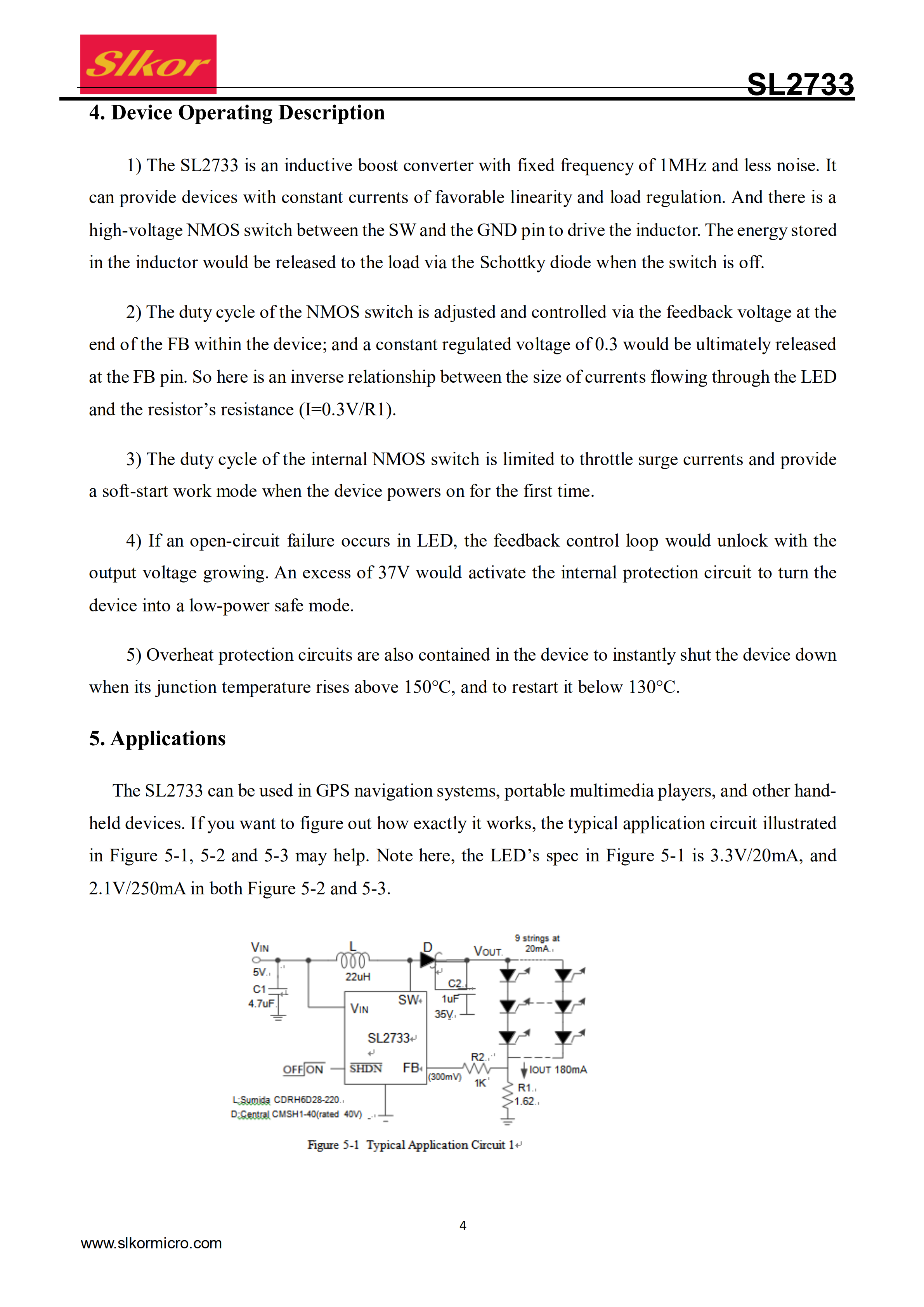 The SL2733 is a DC/DC boost converter that can provideconstant and precise drive currents for multiple LEDs synchronously. With a fixed switching frequency of 1MHz, the SL2733 can be used with external ceramic capacitors and inductors with small consumption. Also, the SL2733 can drive multiple LEDs connectedin series via an adjustable current set by an external resistor R1. And the SL2733 might prove most useful in driving LEDs of the same type, with 9 white LEDs at most connected in series simultaneously, or driving